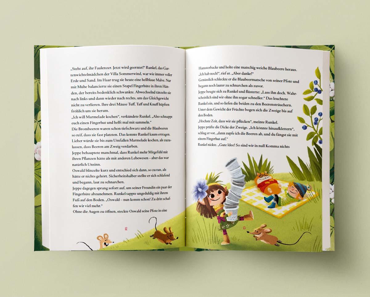 Aufgeregt machen sich Runkel, Jeppe und Oswald auf zum Kastanienwald, um gemeinsam mit den Waldwichteln alle Aufgaben zu übernehmen, die kurz vor dem Herbst so anstehen: das Moos bürsten, Blattmuster entwerfen, Blätter bemalen und für einen angenehmen Raschelton sorgen.