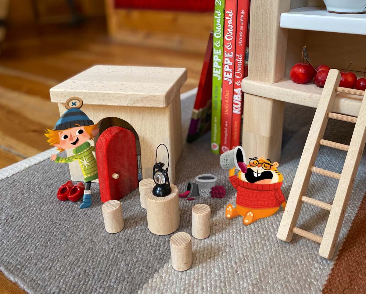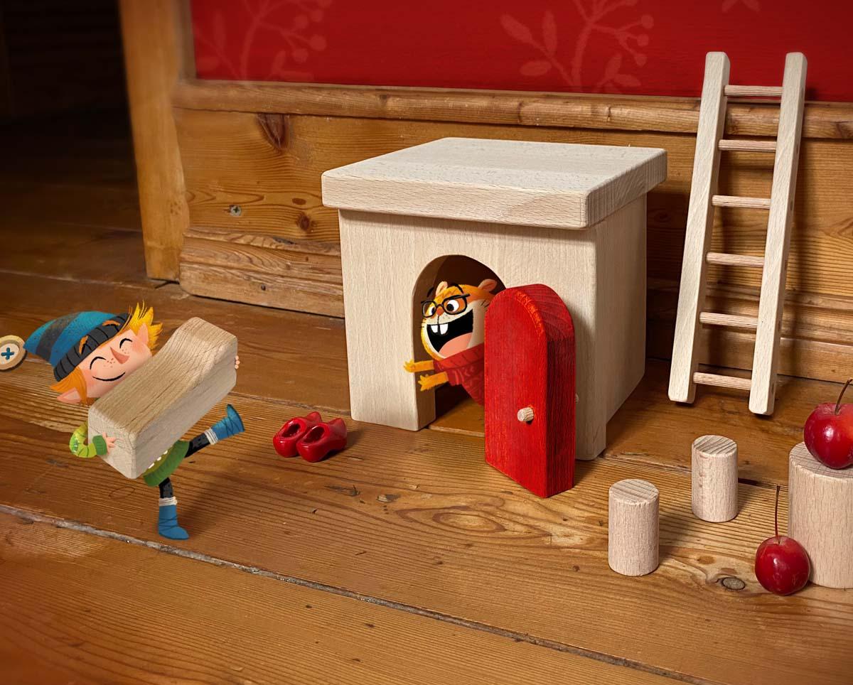 Eine Leiter, ein Bett und fünf runde Bauklötze, die sich wahlweise als Sitzgruppe, Haus-Stelzen oder Schornsteine verwenden lassen, gehören zu Jeppes Wichtelhaus dazu.